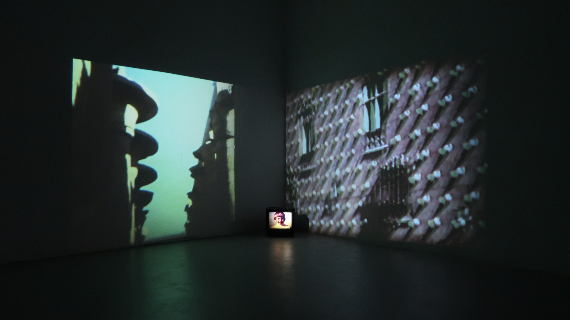 3-channel video installation: two angled projections on the wall and a small monitor (14') on the floor in the center of the two large projections. 4 min. Loop projection.