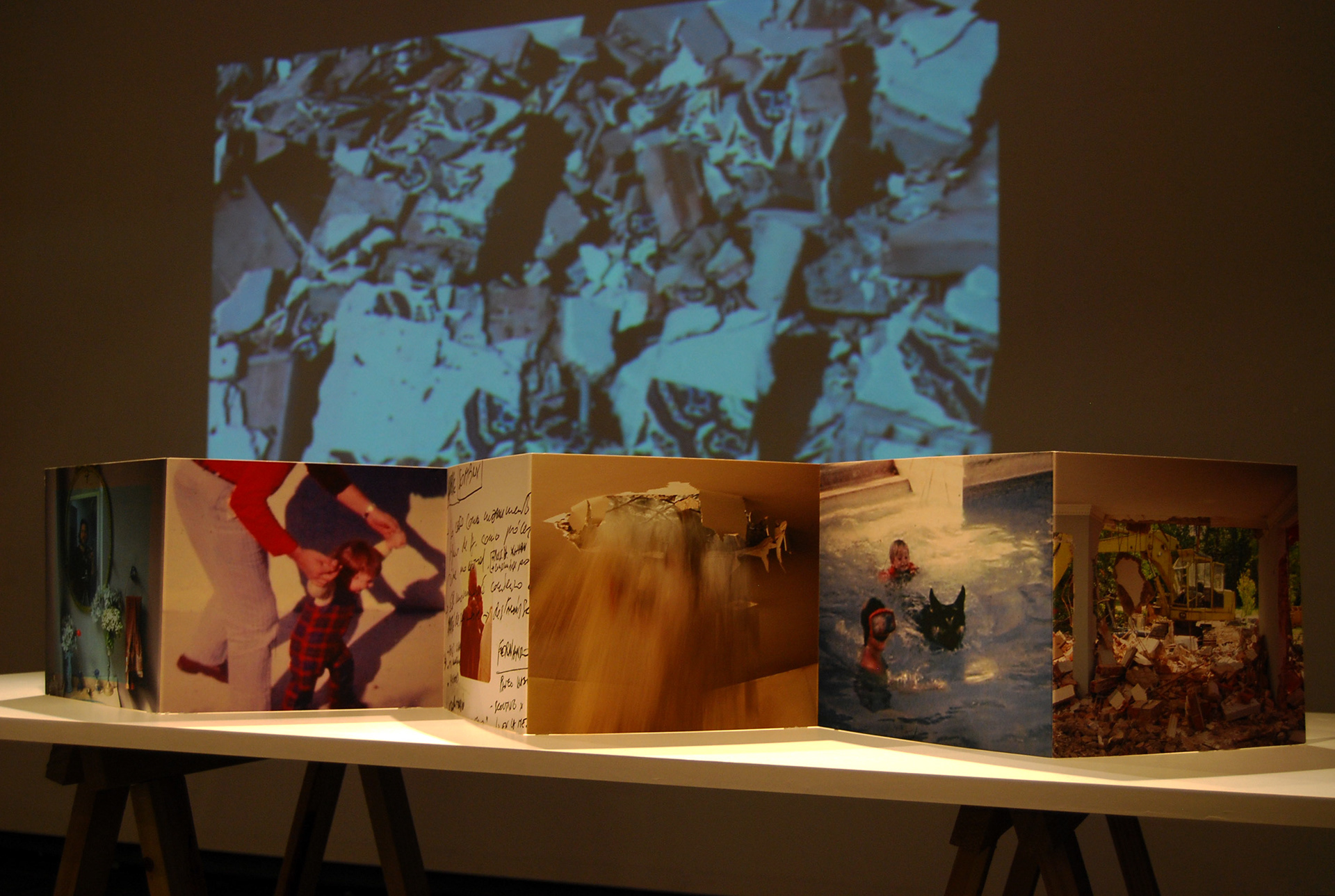 La obra -en su formato instalación/objeto- reconfigura dos obras mías anteriores: la película La sombra y el libro de artista La piel de la memoria, en un gesto de reorganización de sus materiales para generar nuevos significados y lecturas que aluden a la memoria y la destrucción como un exorcismo personal. La figura del objeto remite a una arquitectura y un laberinto, generando una representación espacial -escultórica- del tono elegíaco de la película, el viaje por la memoria y el derribo de un símbolo.